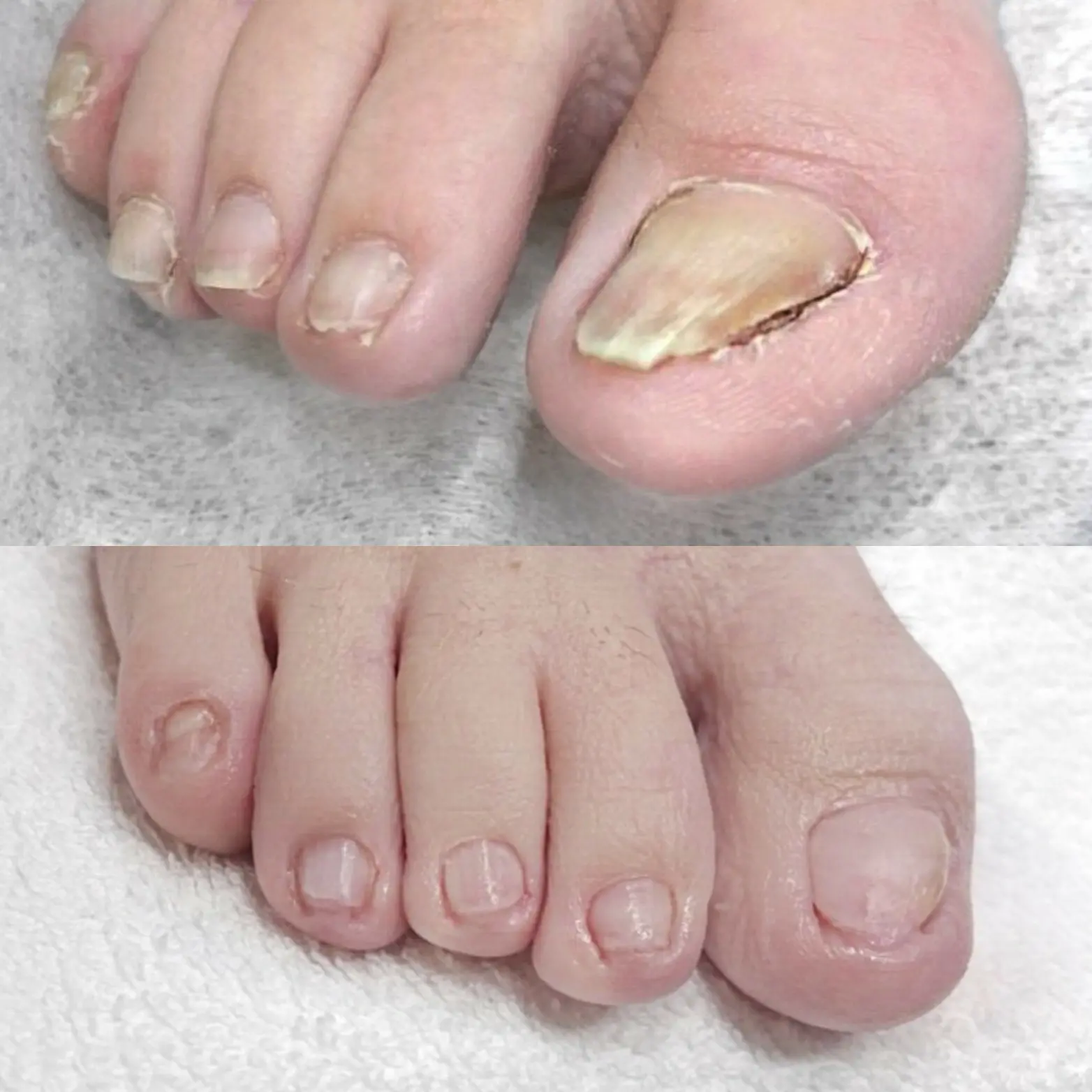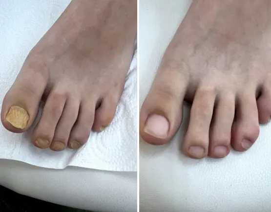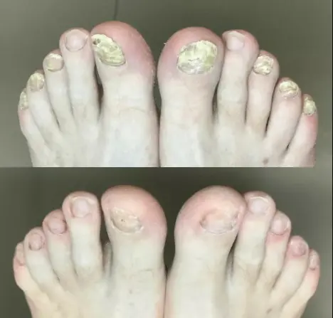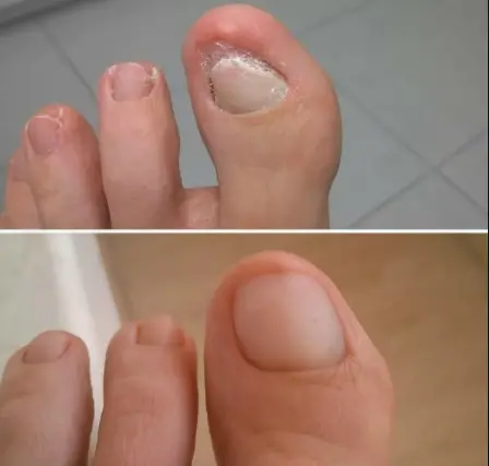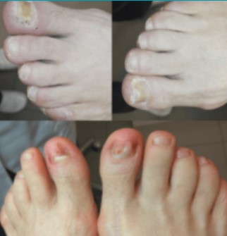 Menos de una semana después, las uñas tenían mejor aspecto. Y al cabo de 3 semanas, la uña estaba bien separada del lecho ungueal: cortamos la uña enferma de la parte superior y la nueva uña estaba sana y rosada por debajo.